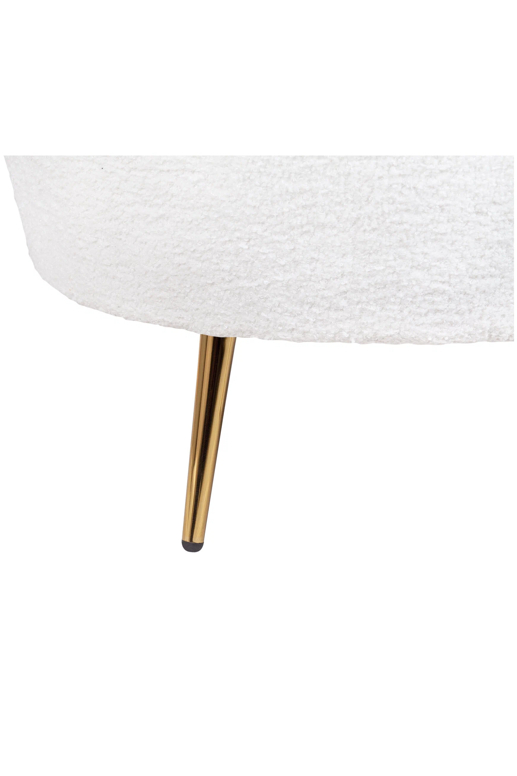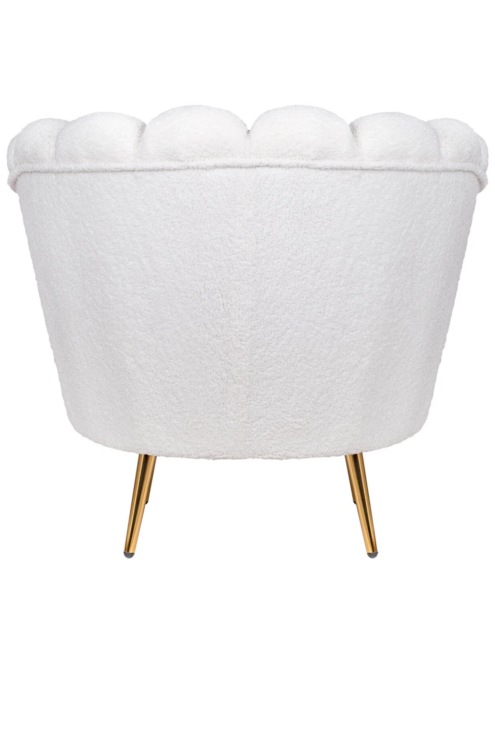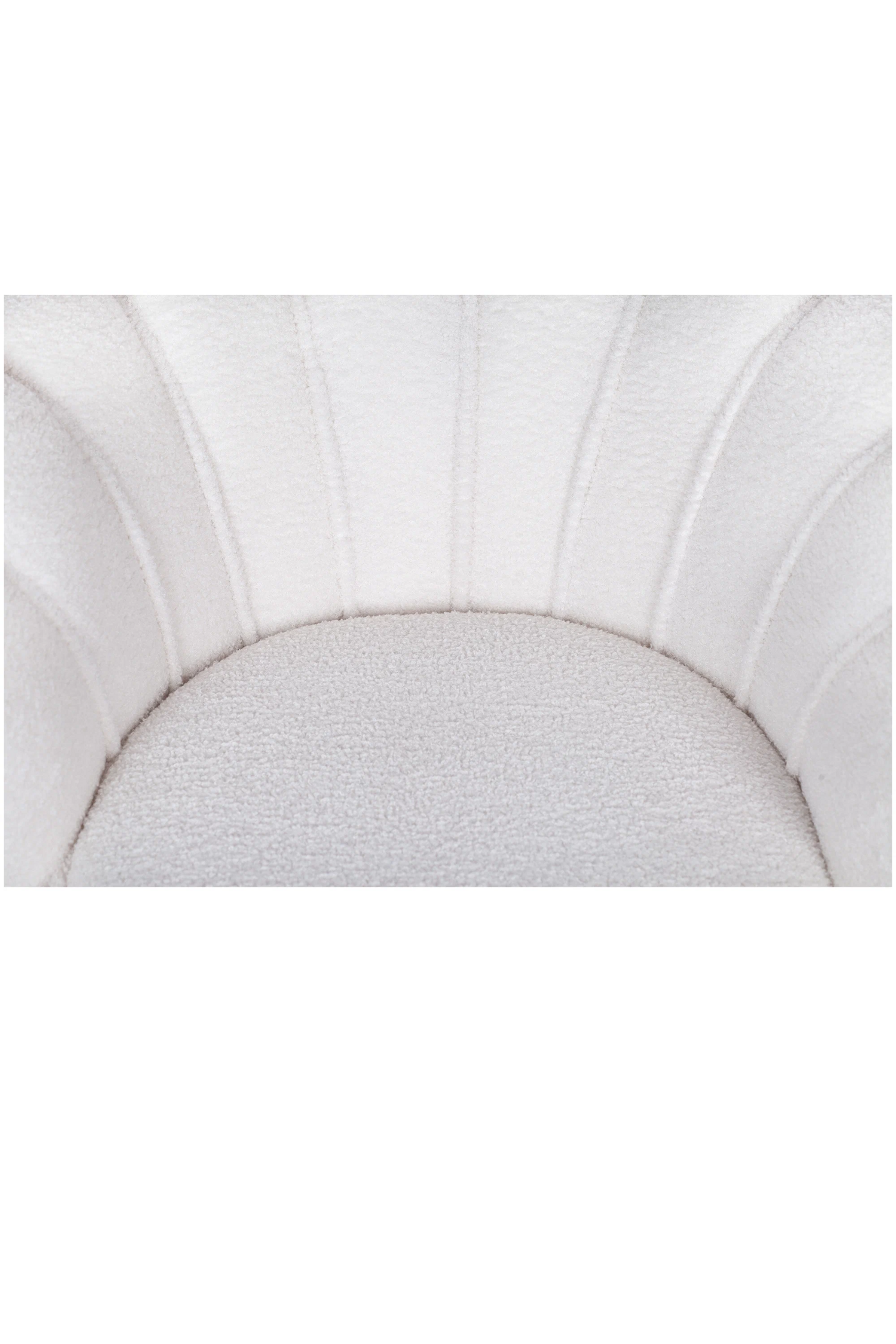 Кресло изготовлено на основе каркаса из натурального дерева и металла, что гарантирует его прочность и долговечность. Обивка выполнена из букле белого цвета, декорированного продольными стежками на внутренней стороне спинки.